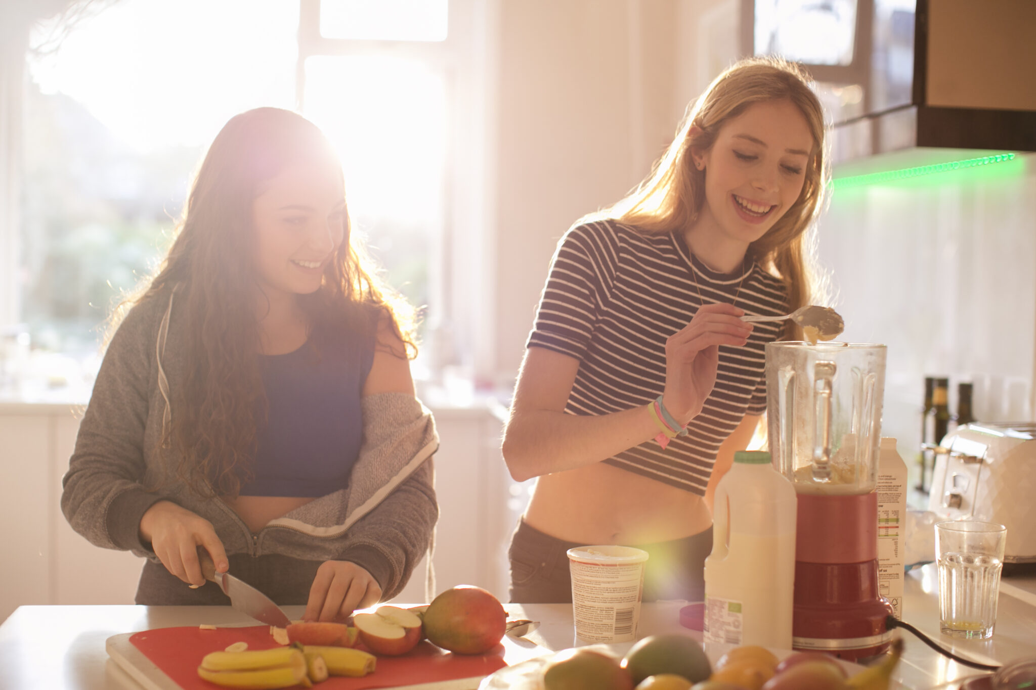 Teenage girls making smoothie in sunny kitchen