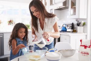Young Hispanic girl making cake in the kitchen with help from her mum, waist up